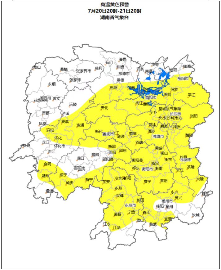 省气象台今天发布高温黄色预警:预计21日,株洲、湘潭、衡阳、郴州、永州、娄底东南部将达到35℃以上高温,局部地区将达37℃以上。