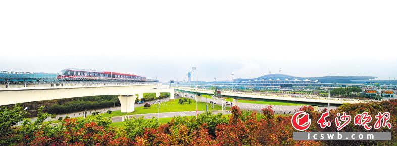 湖南自贸试验区长沙片区临空区块重点发展临空经济和外贸产业,引领湖南“走向世界”。图为长沙黄花国际机场及磁悬浮列车。图片除署名外均为湖南自贸试验区长沙片区管委会提供