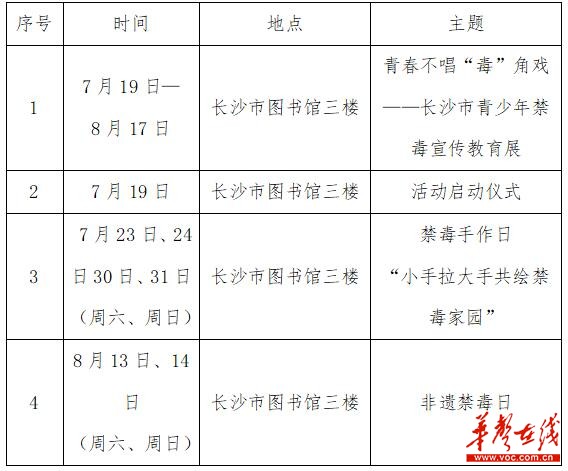 展览期间,主办方还将邀请非遗匠人现场展演,邀约专业美术机构现场教学,举办禁毒手作日、非遗禁毒日等线下主题活动,参与活动的青少年可在现场盖湖南(长沙)禁毒教育基地社会实践活动章。