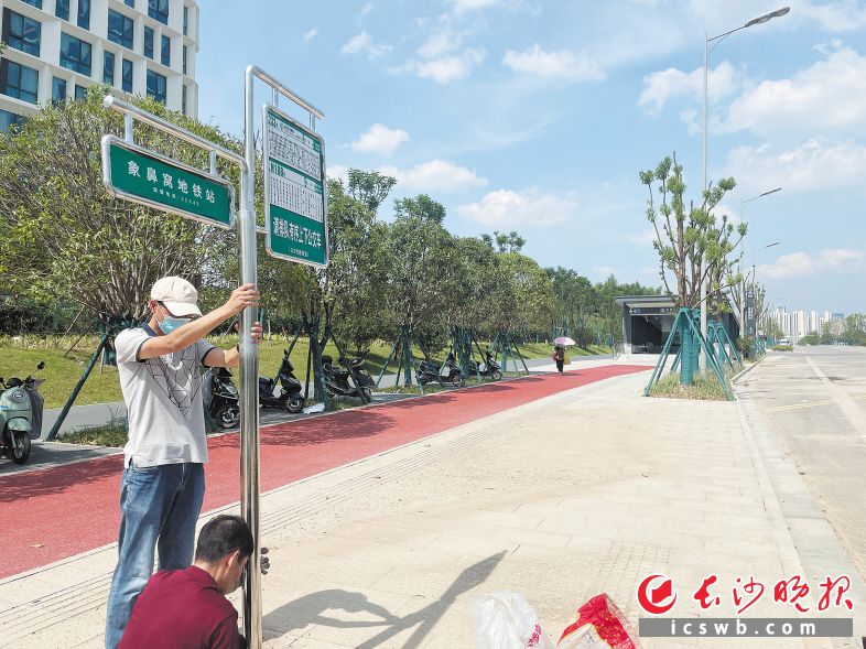 在象鼻窝地铁站出入口约50米处,工作人员设立新公交站牌。长沙晚报全媒体记者 聂映荣 摄