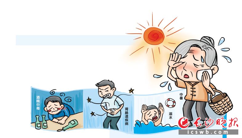 长沙市120急救中心提醒,三伏天重点防范酒精中毒、胃肠道疾病、中暑、溺水等健康问题