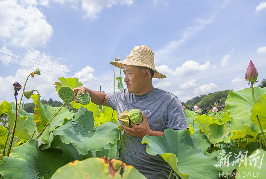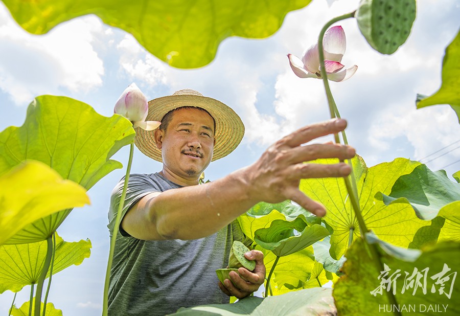 7月14日,攸县宁家坪镇双凡村,莲农冒着高温酷暑采摘莲蓬。夏季正是欣赏荷花,品尝莲子的好时节,莲农也到了最忙碌的时候。近年,该村特色产业发展有声有色,为乡村振兴注入强劲动力。 全媒体记者 李健 陈普庄 摄影报道