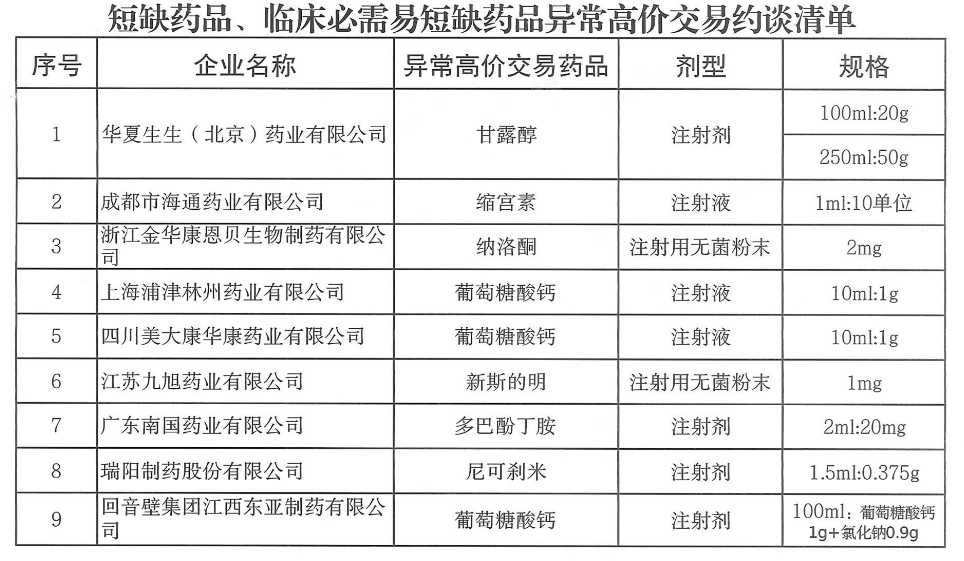 除此之外,成都倍特药业250ml:50mg的甘露醇注射液、辰欣药业0.4mg的纳洛酮等9家企业的9个品规也存在高价交易问题。但由于这些品规在省际价格联动之后就已停止挂网,遂不再做处理。