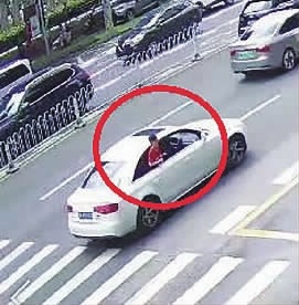 ▲7月6日,长沙市天心区,一台白色奥迪小车上,一名小男孩将上半身探出车窗外。