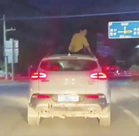 ▲7月4日,岳阳县交警大队接到举报,一台行进中的白色越野车车顶,一名小男孩爬上去玩耍,仅用右手抓住车顶行李架固定身体。