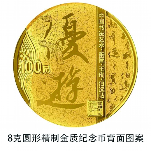 其中,8克圆形金质纪念币背面图案为东晋王珣书《伯远帖》局部文字及“优游”字样与装饰纹样、“中国书法艺术”篆刻钤印等组合设计,并刊“中国书法艺术·东晋·王珣·伯远帖”字样及面额。