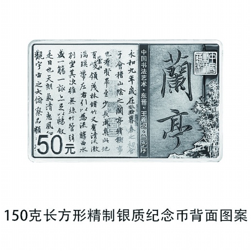 150克长方形银质纪念币背面图案为东晋王羲之书《兰亭序》局部文字及“兰亭”字样与竹林、亭子、“中国书法艺术”篆刻钤印等组合设计,并刊“中国书法艺术·东晋·王羲之·兰亭序”字样及面额。