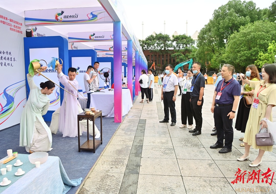华声在线7月3日讯(记者 陈奕樊 李健)3日上午,在“技能中国行2022——走进湖南”绝技绝活展示现场,来自怀化的茶艺师罗满手持嘴长一米多的长嘴铜壶向现场观众展示茶武绝活。只见他翻转腾挪,提壶把盏,整个过程行云流水、刚劲有力,一招一式皆是功夫。