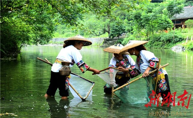 沿着几十公里长的“黄金茶谷”一路前行,两岸青山如黛,苗族特色民居鳞次栉比。小溪里,不少村民正在挽起裤脚捞“桃花虫”。