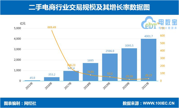 网经社日前发布的《2021年度中国二手电商市场数据报告》显示,2021年我国二手电商交易规模达4001.7亿元,同比增长29.27%。