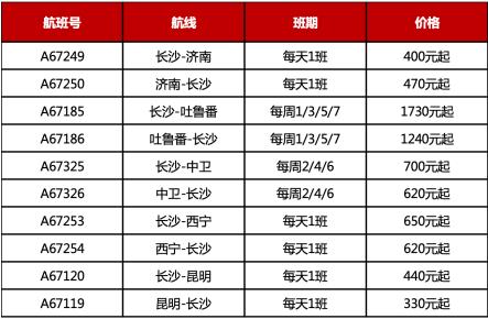 长沙作为湖南航空主运营基地,暑运期间,湖南航空将继续运行长沙—济南、长沙—吐鲁番、长沙—中卫、长沙—西宁、长沙—昆明等热门旅游航线。其中,长沙—济南航线、长沙—西宁航线、长沙—昆明航线班期均为每天一班,长沙—吐鲁番航线班期为每周一三五七,长沙—中卫航线航班为每周二四六。