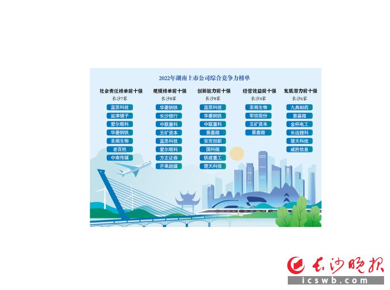 从报告中记者梳理发现,长沙A股上市公司表现亮眼。在2022年湖南上市公司规模榜单前十强中,长沙的上市公司共有8家,分别为华菱钢铁、长沙银行、中联重科、五矿资本、蓝思科技、爱尔眼科、方正证券、芒果超媒。