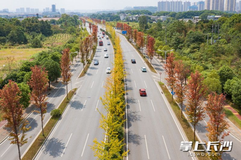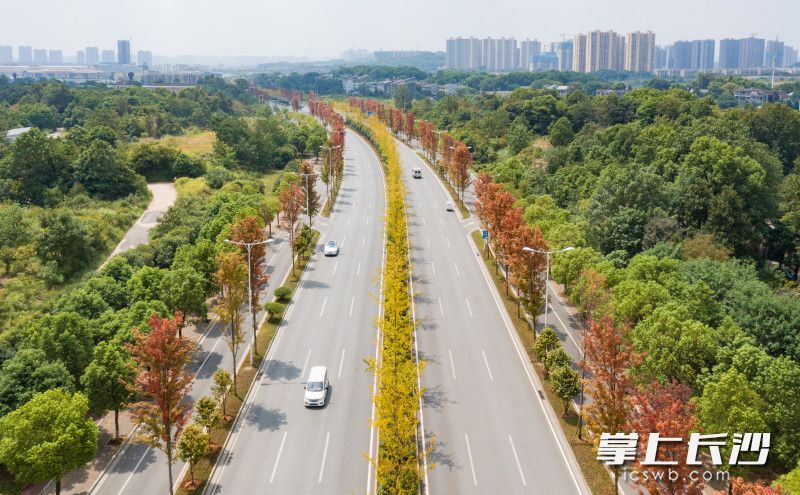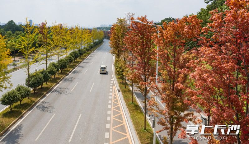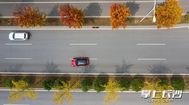 车辆行驶在枫叶红了的开福大道(兴联路以北段)上。图片均为长沙晚报全媒体记者 邹麟 摄