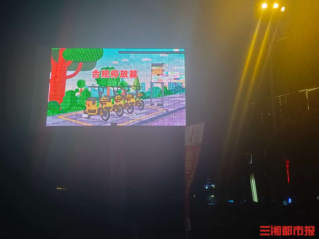 (江华图腾公园,“强国电单车”联合城管局在公园显示屏播放文明骑车规则,倡导市民文明骑行、共建文明城市)