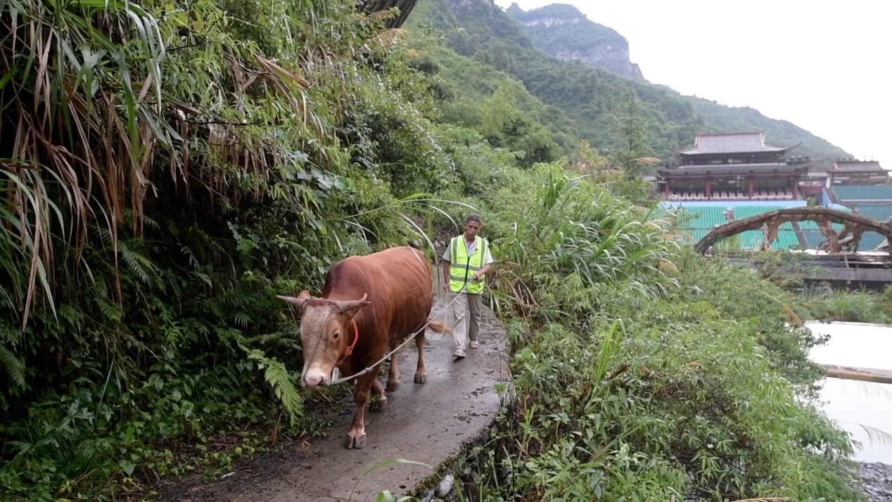 “别吃太饱了,屎尿拉在舞台上就不好了。晚上演出完后,我再带你去吃‘宵夜’。”演出季的每天下午四五点钟,张正发就会把在山上吃草的牛接回家,带牛拉屎排尿等,做好演出前的准备工作,然后就出发去剧场。这条通勤路,他们已经走了13年。