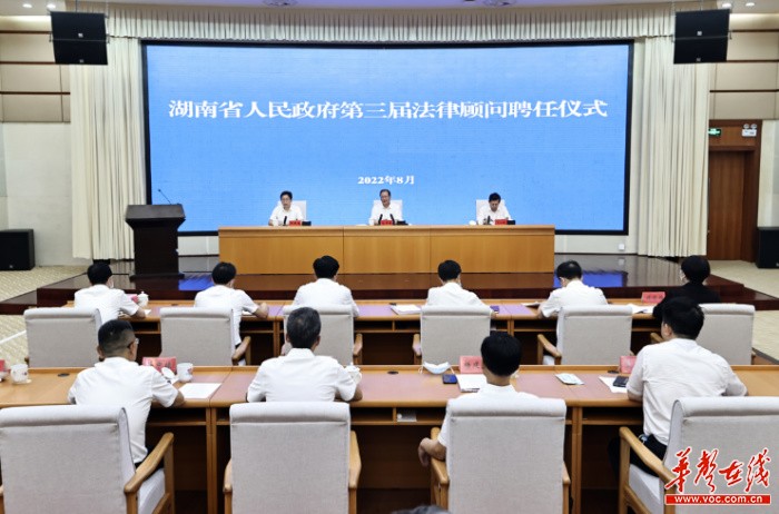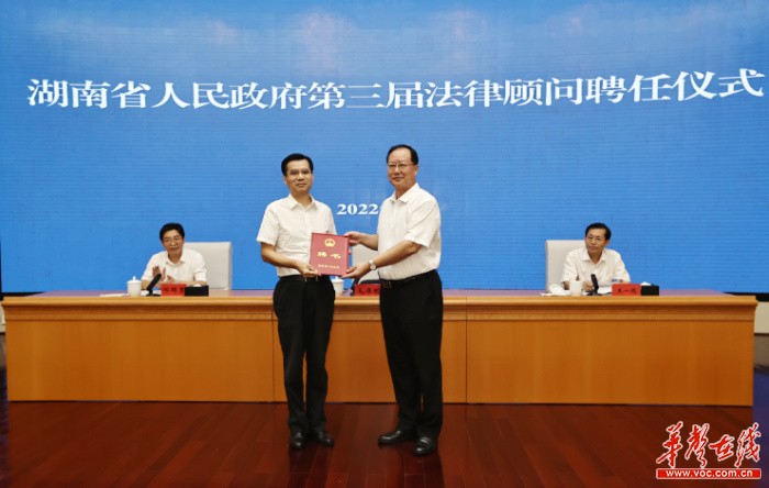 华声在线8月16日讯(全媒体记者 孙敏坚 黄晗)16日下午,省政府第三届法律顾问聘任仪式在长沙举行,10名法学专家、律师和3家律师事务所受聘为省政府法律顾问和顾问单位。省委副书记、省长毛伟明向受聘人员和律师事务所负责人颁发聘书并讲话。他强调,要以习近平法治思想为引领,充分发挥政府法律顾问制度作用,加快推进法治政府建设,着力打造市场化、法治化、国际化营商环境。