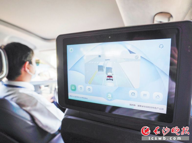 副驾驶后背显示器上显示着实时路线与周边环境。长沙晚报全媒体记者 冯启阳 摄