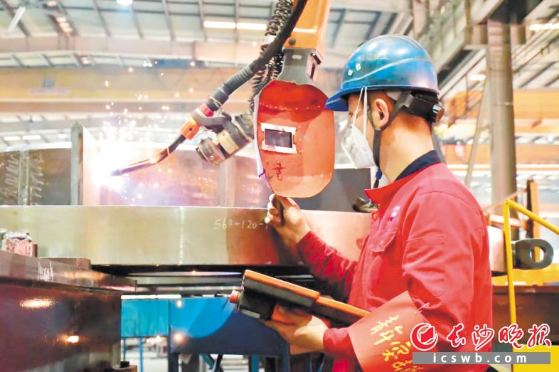 在铁建重工长沙第一产业园区制造生产车间,只见焊花飞溅,电弧闪耀,焊接机器人“手舞足蹈”。制造总厂智能一班专门负责掘进机主驱动、变速箱等核心部件焊接工作。4月以来,该班组成立“青年突击队”,共计完成了多个项目核心部件的生产任务。