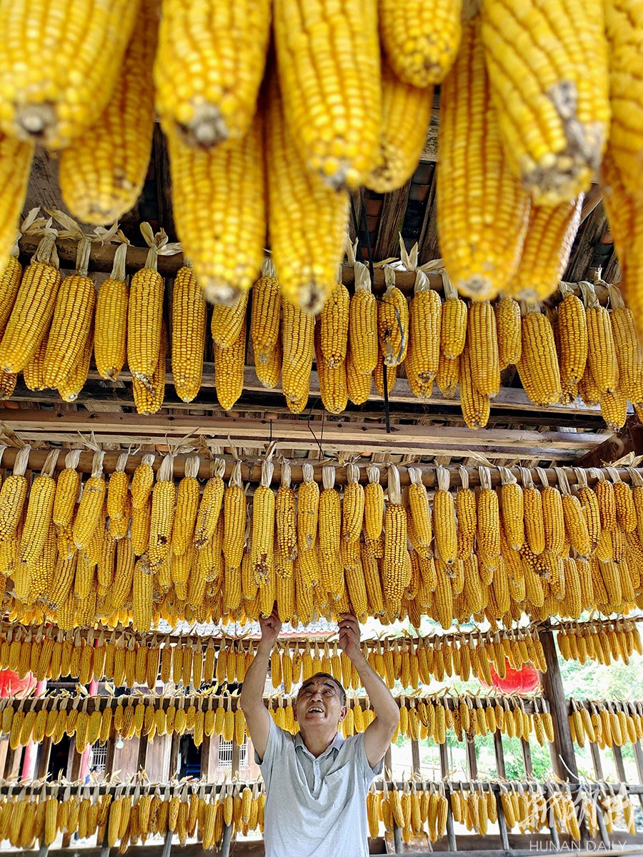 8月12日,城步苗族自治县丹口镇边溪村,苗族群众在吊脚楼上晾晒玉米。近日,当地农民抓住晴好天气抢收并及时晾晒玉米。严钦龙 摄