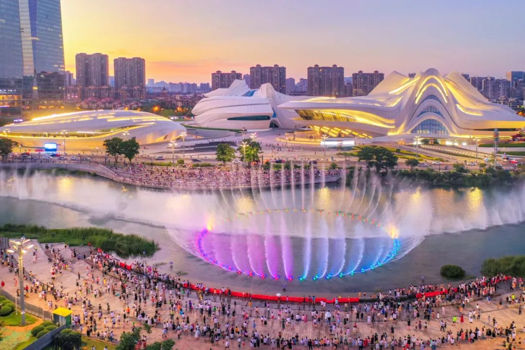 (天热人更“热”。8月6日傍晚,长沙市湘江新区梅溪湖的音乐喷泉,吸引众多市民和游客前来观看。华声在线全媒体记者 郭立亮 摄)