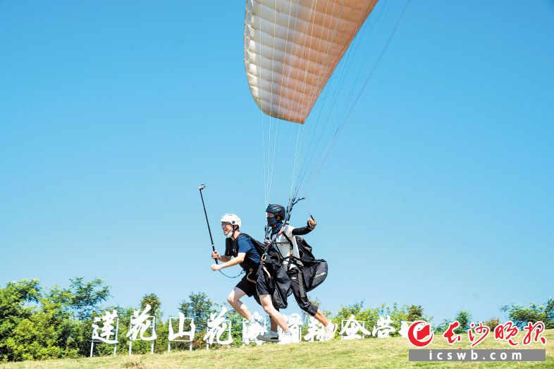 亲子飞、情侣飞、闺蜜飞、兄弟飞、团建飞……采访当天,记者遇到各式各样的滑翔伞体验组合。距离最近的一家人来自莲花本地,远方的客人则来自湖南其他市州以及安徽、广东、江西等周边省份,其中不少外地游客的计划是:花费一周时间游玩长沙主要景点以及周边网红乡村,再去张家界、韶山等知名景点。