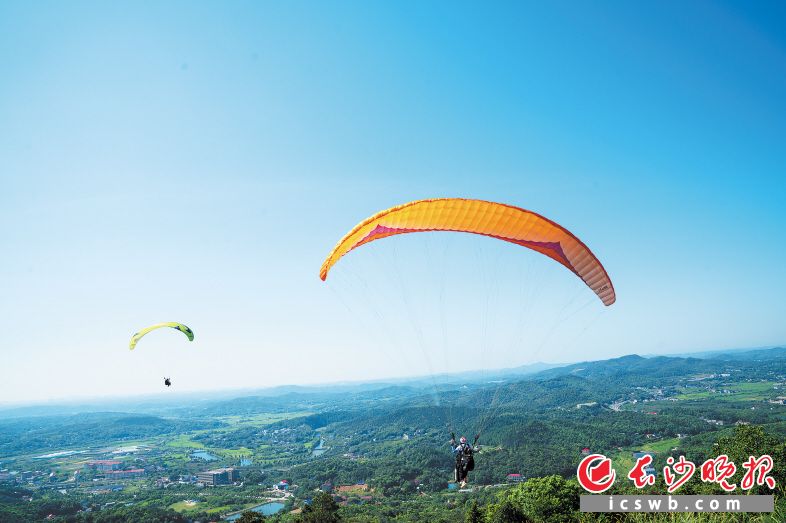 8月9日清晨,长沙市岳麓区莲花山滑翔伞基地迎来第一波体验游客。拽伞、起飞、滑翔、冲刺、落地……在专业滑翔伞教练的指导下,游客们像轻盈的鸟儿般飞上云霄,体验“乘风好去,长空万里,直下看山河”的空中清凉之旅。