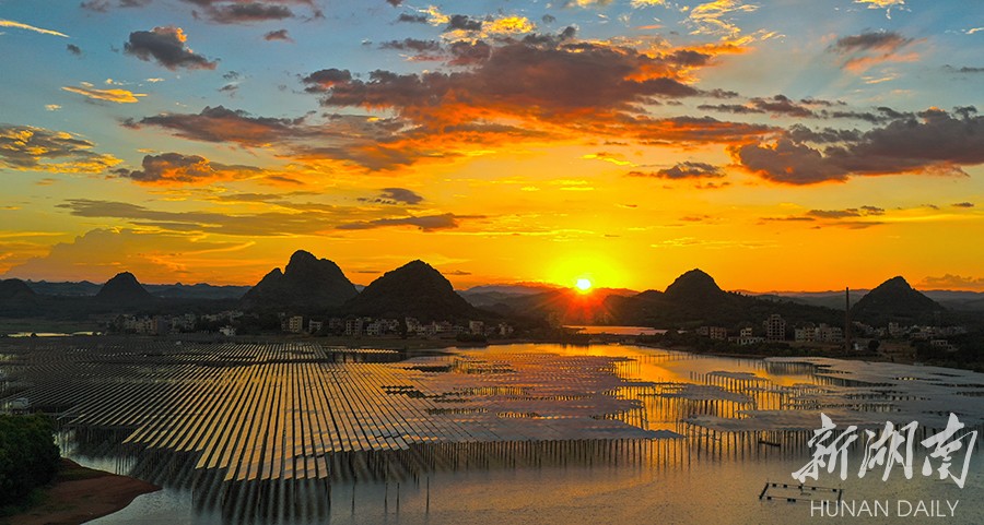 8月9日傍晚,嘉禾县千家湖风光旖旎。水上光伏与村庄、山峰相互映衬,呈现出一幅山水相依、景色迷人的秀美画卷。郑时仁 摄