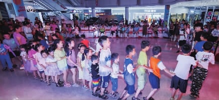 8月7日晚,小朋友正在一购物中心中庭参与互动活动。实习生 覃昕昱 摄