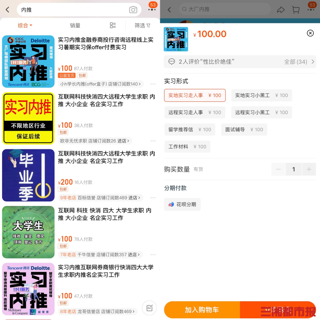 华声在线8月7日讯(文/视频 全媒体记者 刘镇东 黄京 实习生 唐清清 徐婧婷 蒋友宏 邓虎)“2万元进头部快消”“四大、咨询、广告任你挑”“海量名企内推直通”……近日,来自长沙某高校的小夏(化名)同学向三湘都市报的记者反映,她在求职过程中发现,心仪已久的“四大会计师事务所”实习岗位内推被挂在网络上公开售卖。不少人愿意付费买单“刷简历”,“付费实习”似乎成为大学生就业的“新出路”。