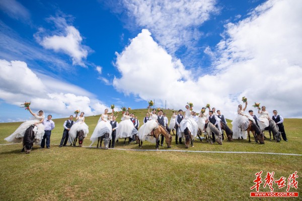 20对新人在郴州仰天湖大草原景区举行“马背上的集体婚礼”。
