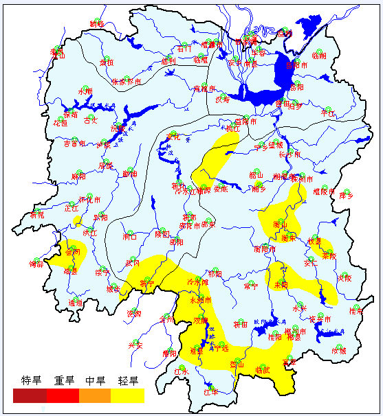 省气象水文部门预测,8月份全省降雨量湘南地区接近常年,湘北地区较常年偏少2成左右,湘中地区偏少2~5成,气温较常年偏高1~2℃。省水利厅结合当前工情及后期天气形势,预测未来半个月省内无大范围干旱。若高温晴热天气持续,后期湘中及以北局地可能发生轻度干旱并发展蔓延,主要为插花型,风险在天水田、高海拔山区分散式供水工程。