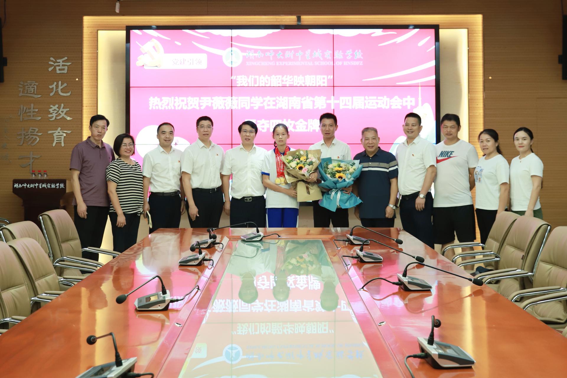 尹薇薇是湖南师大附中星城实验学校2011班的一名初三学生,1.7米的个头,皮肤黝黑发亮,外形瘦瘦弱弱的她可是个名副其实的“小飞人”。她在刚刚结束的湖南省第十四届运动会田径比赛中一举夺得U14组女子200米冠军、U14女子短跑全能冠军、U14女子4*100米接力冠军、U14女子4*400米接力冠军。四金,完美收官这次全省最高级别田径比赛。