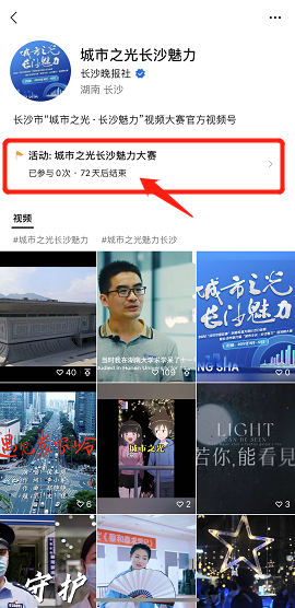 2.进入@城市之光长沙魅力视频号主页点击【活动】城市之光长沙魅力大赛。
