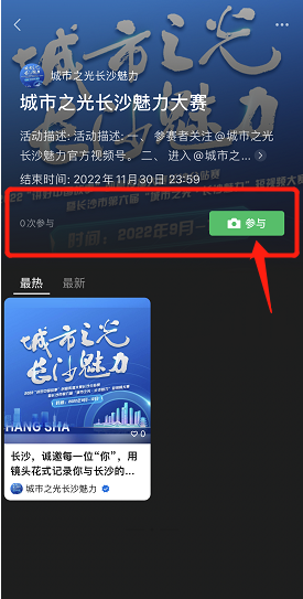 3.点击【参与】上传参赛作品,在文字表述中添加话题#城市之光长沙魅力,并@城市之光长沙魅力,私信城市之光长沙魅力官方视频号(私信注明“报送单位或作者姓名-作品名称-联系方式”),视为成功参与活动。