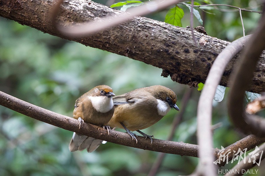 9月18日,两只白喉噪鹛在长沙市岳麓山树林中休息。白喉噪鹛生性胆怯,多在林下地上或灌丛中活动和觅食昆虫。该物种已列入《国家保护的有益的或者有重要经济、科学研究价值的陆生野生动物名录》。 华声在线全媒体记者 张京明 摄