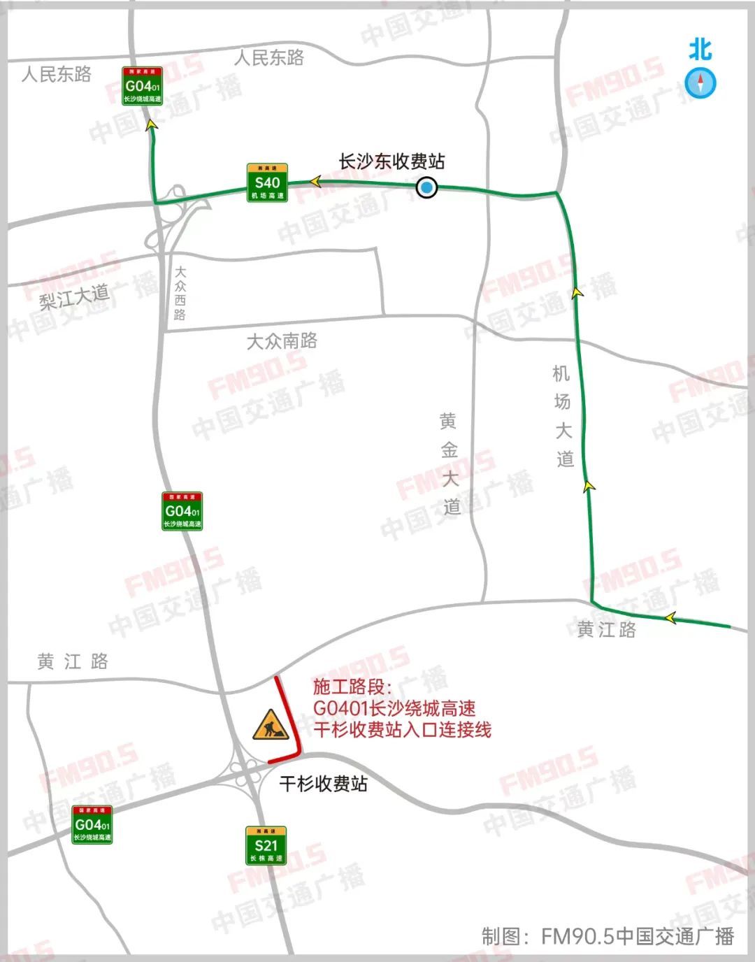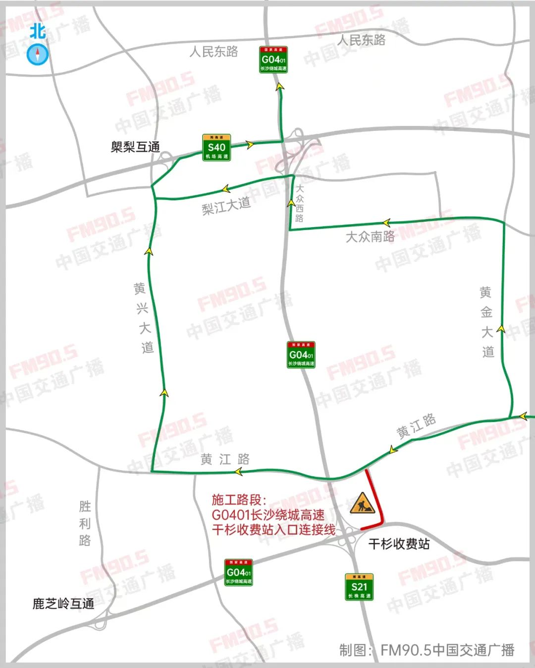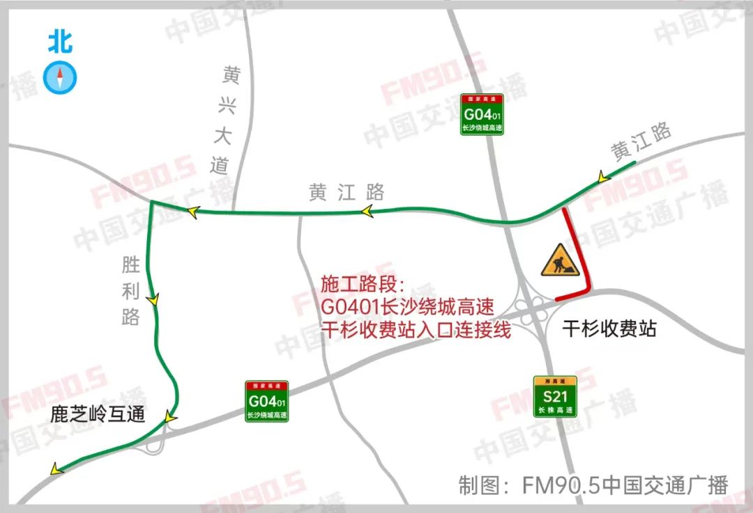 1.建议原计划从干杉收费站上高速前往G4京港澳高速、G0421许广高速、G60沪昆高速方向的驾驶员,选择走黄江路,转古城新街、双鹿路,从G0401长沙绕城高速的鹿芝岭收费站上高速前往。
