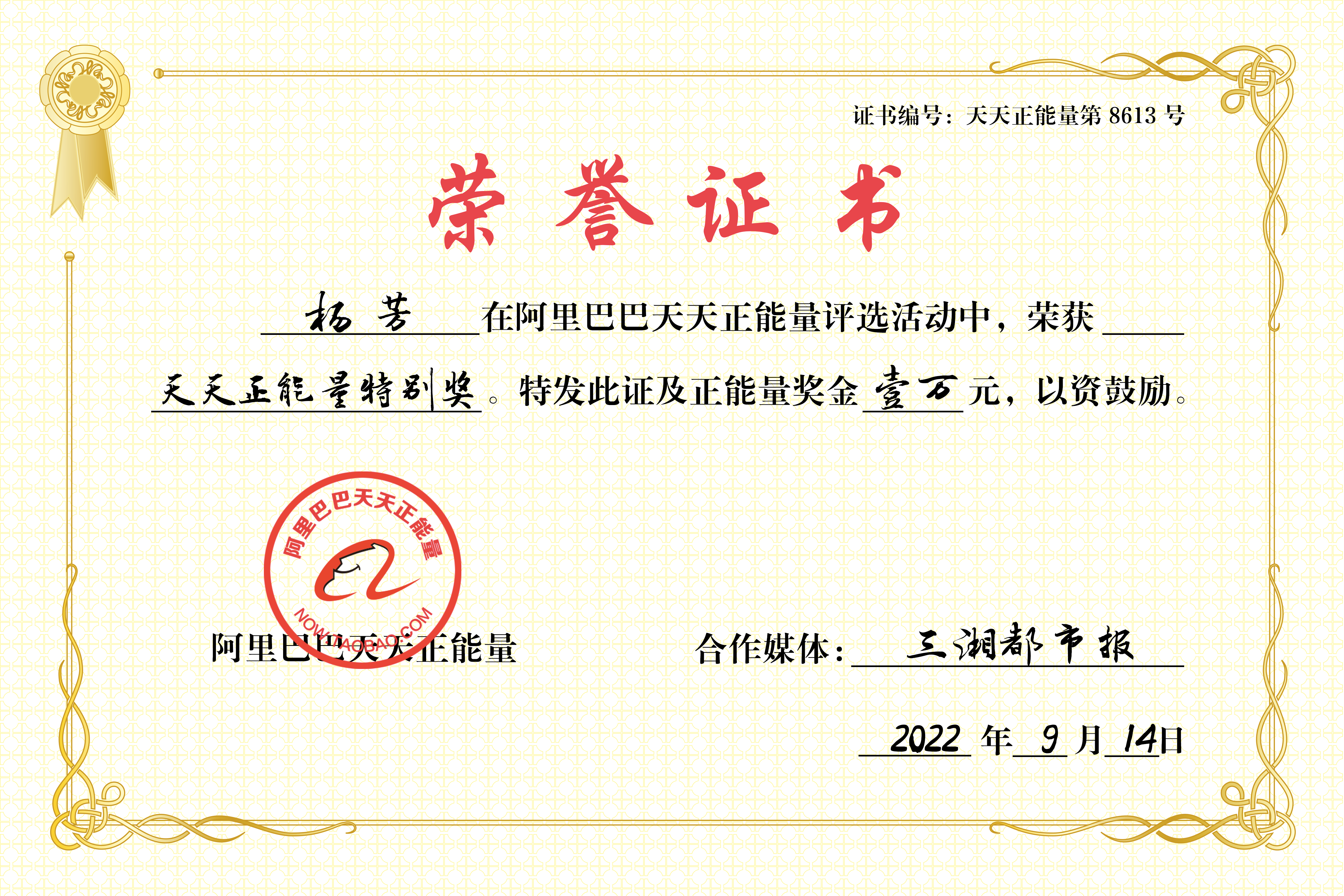 9月14日,三湘都市报联合阿里巴巴天天正能量为杨芳颁发天天正能量特别奖及万元奖金,赞赏这位16岁女孩的英勇和临危不惧。