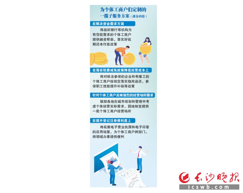 此次为个体工商户量身定制的一揽子服务方案,更强调要适用于其生存发展的需求。在解决资金需求方面,将组织银行等机构为有贷款需求的个体工商户提供融资帮助,指导银行业金融机构加大对个体工商户的信贷投放,落实好延期还本付息政策。