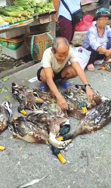 “本来趁着节日拿出来卖,很不容易,没想到鸭子死了,卖不掉就浪费了。”张先生介绍,在当地,过节时有不少老人会从乡下把自己种的菜、养的家禽背到集市卖。他当时听老人说鸭子是自己养的从乡下背来的,在当地这种鸭子一般25元一斤,一只能卖150元左右。