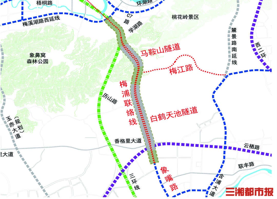 梅浦联络线是湖南湘江新区连接梅溪湖和含浦的南北向“大动脉”,项目北起梅溪湖路西延线,止于含浦片区象嘴路,全长4.45公里。其中梅浦联络线北段(梅溪湖西延线-学湖路)已于2021年完成建设,目前正在建设的梅浦联络线南段设计为双向6车道,北接已建成的梅浦联络线北段,向南延伸与梅江路相交,设置隧道穿越桃花岭景区及白鹤天池山体,以及香格里大道和云栖路,与含浦片区的象嘴路顺接。项目由湘江集团湘新投公司投资建设,由中铁五局和中建五局分两个标段进行施工。
