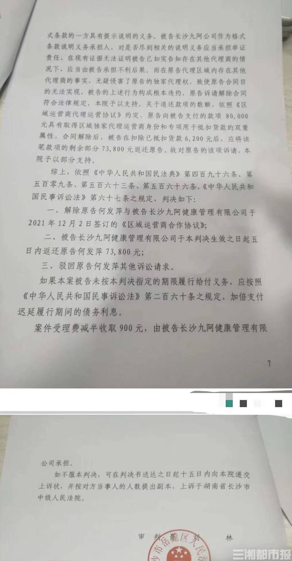 近日,长沙市岳麓区人民法院一审判决:解除双方协议,被告长沙九阿返还何先生剩余款项共计73800元。