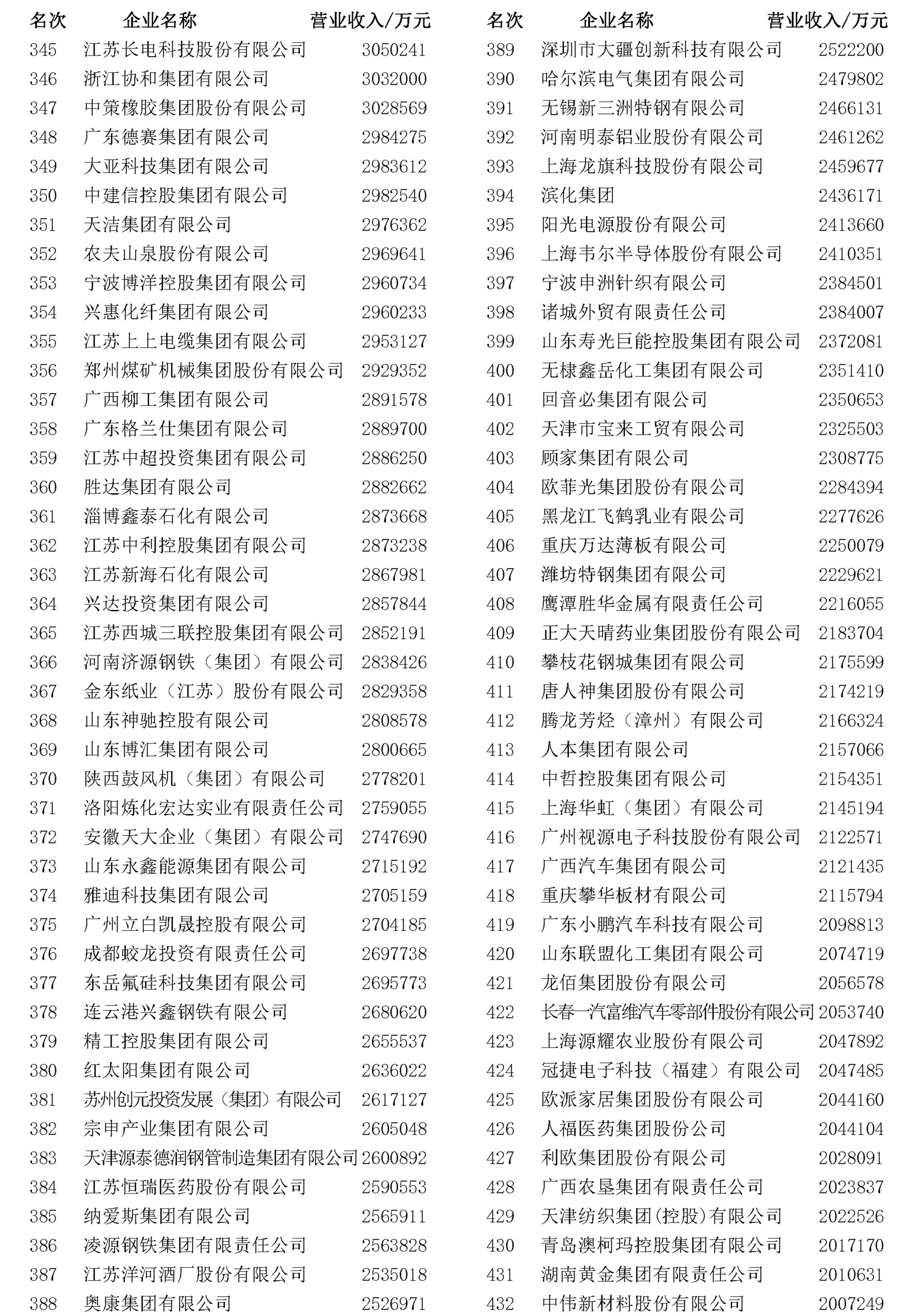 湖南入围的6家制造业企业分别是:湖南钢铁集团有限公司2021年营收2197.06亿元,第49位;三一集团有限公司营收1545.6亿元,第76位;中联重科股份有限公司营收671.3亿元,第159位;湖南博长控股集团有限公司营收621.57亿元,第174位;湖南五江控股集团有限公司营收369.87亿元,第303位;湖南黄金集团有限责任公司营收201.06亿元,第431位。