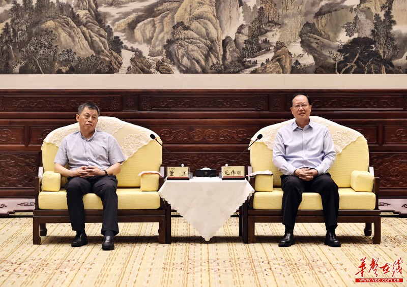 (8月31日晚,省政府邀请出席通航产业博览会的嘉宾共商“蓝天”发展大计。图为省委副书记、省长毛伟明与中国人民解放军空军副司令员董立座谈 。)