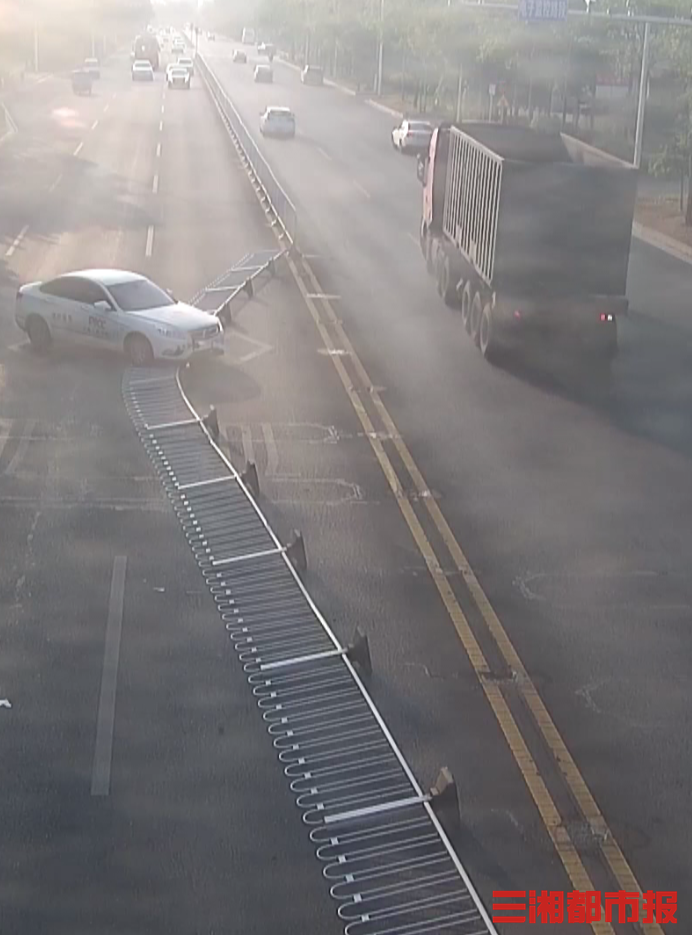 10月23日上午10时,湘潭雨湖区北二环,公共场所视频显示,当时,一辆行驶在最左侧车道的重型货车开启右转向灯向右实施变道,结果撞上中间车道一辆白色小车的左后侧。货车推着白色小车行驶一段距离后,白色小车失控撞上中央护栏,旋转大半圈后,冲入对向车道。所幸当时对向车道恰好出现一段车流空档,才没酿成更严重的后果。而被撞倒的护栏倒下时飞溅起来的墩子,又砸中后方一辆灰色小车。