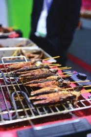只见穿着统一迷彩服的展位工作人员一阵忙碌,在烤架上的一条条鱼上撒下简单的香料,顿时鲜香无比。此时只需轻轻咬上一口,鱼肉的细腻鲜嫩随着滋滋冒的黄油在唇齿间迸发,香气四溢,直让你恨不能再生出一只胃来,这样便可再多吃两只。