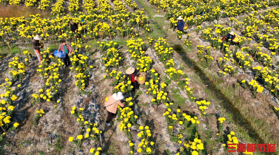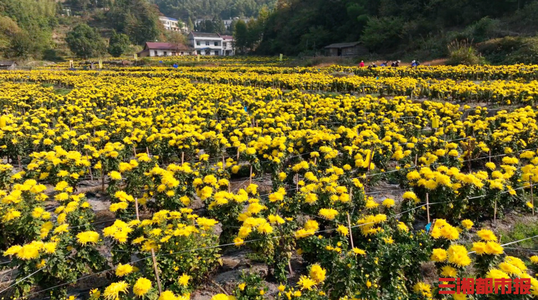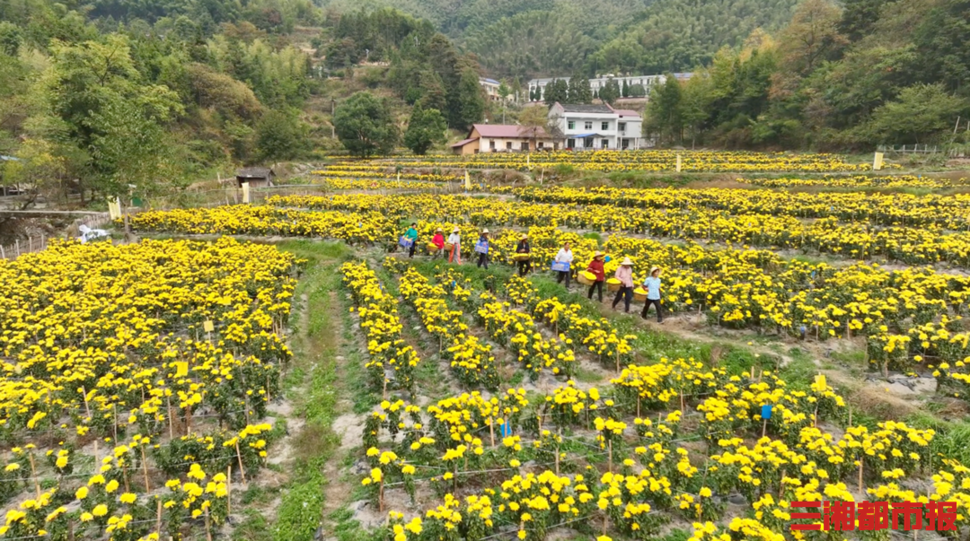 据了解,皇菊花基地位于南岳衡山国家级自然保护区800米左右的坡地上,这片基地的面积达600多亩。正值金秋,只见成片的皇菊花竞相绽放,芬芳艳丽,整座山村之中满眼的都是菊花,像俨然一派“世外桃源”的景象。菊农们挎着竹篮,穿梭于田间地头,手法娴熟地摘下一朵朵菊花,畅享丰收的喜悦。