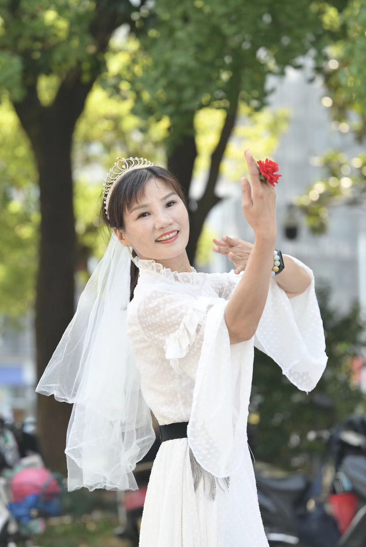 在凉亭旁边,覃女士和朋友们正在热情起舞。舞曲欢快,步子紧凑,衣裳隆重,笑容灿烂,舞伴之间配合默契,周围站了一圈围观者。记者抓拍了覃女士和朋友跳舞的瞬间,并当场将照片打印下来,送给了她们。