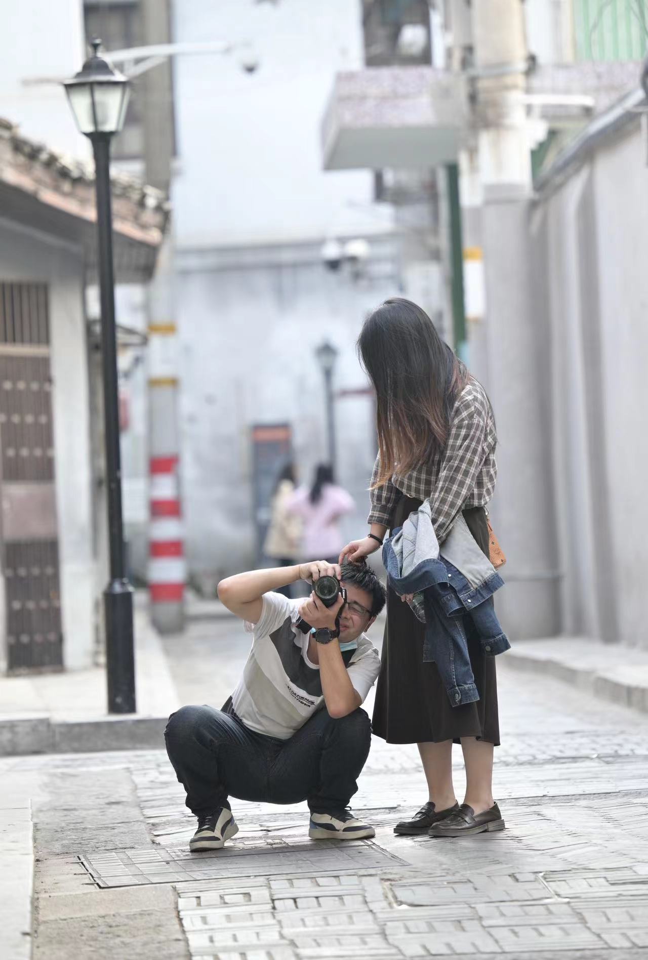 一对情侣,男生正在给女生拍照。记者远远地观望,为两人留下一张合影:男生正在查看相机里的照片,女生站在一旁,摸摸男生的头发。两人看起来都很青涩,在接过这张合影时,居然害羞得不敢看对方的眼睛。