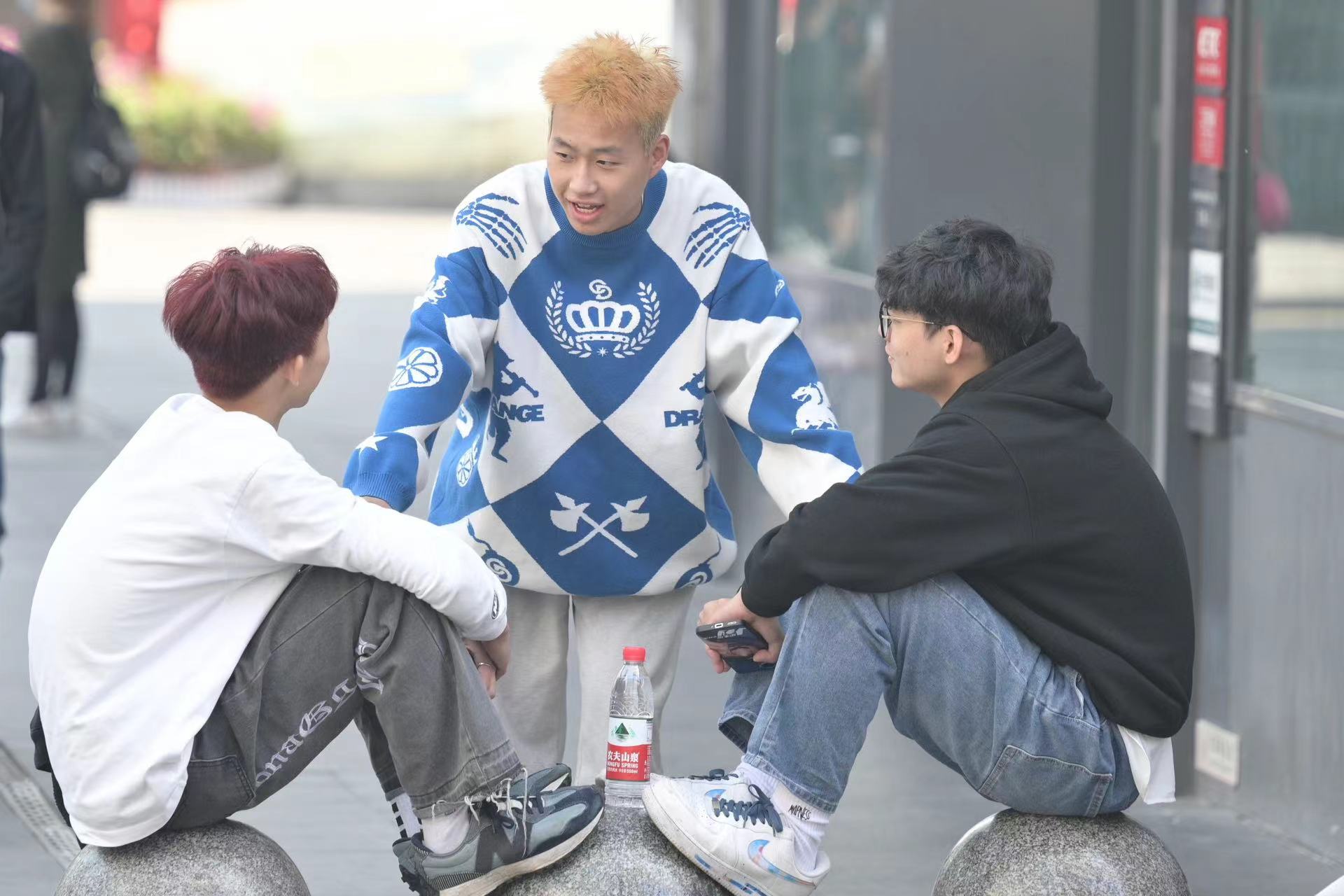 接近正午,五一广场正在苏醒。记者路遇三名年轻小伙:其中两位面对面坐在石头路障上,剩下的那位站在中间,双手撑着伙伴们的肩膀。他们打扮潮流,三个脑袋上有三种发色,说说笑笑,在接过记者递去的照片时,还不忘对镜头比“耶”。