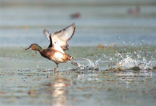 在河北省白洋淀水域,一只青头潜鸭振翅欲飞。 河北日报记者 李东宇 摄